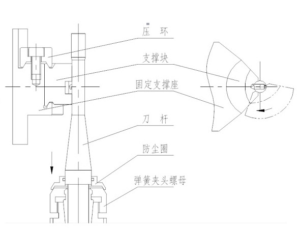 飞刀支撑结构借鉴了意大利的同类型机床的特点,支撑块采用圆弧面支撑,支撑效果好,同时在刀杆顶端用活动顶尖支撑,来提高刀杆的支撑刚性和精度。